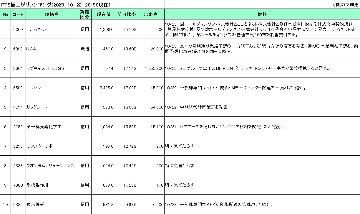 カブ知恵発 PTS値上がりTOP10(2025/10/23)