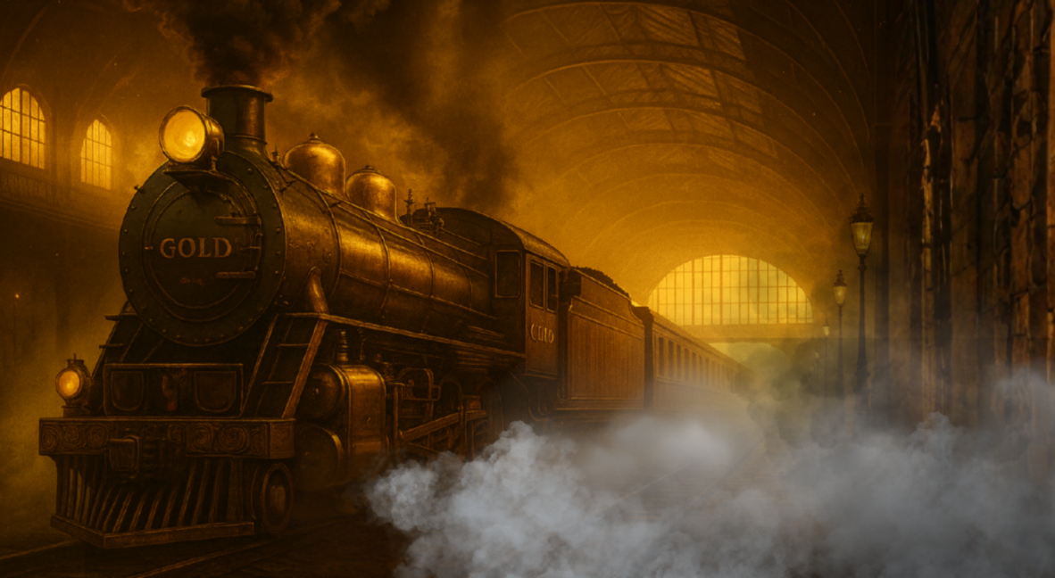 夜明けの霧に包まれたホームに、黄金に輝くGOLD 聖杯列車が停車!