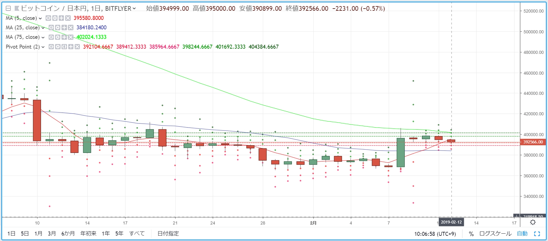 画像は2019年2月12日のキャプチャ。昨日は主要どころが1~3%の下落となっていましたが、今日はビットコイン、ビットコインキャッシュが下落、リップル、イーサリアム、ライトコインは上昇という相場環境です。ビットコインが弱気で、その他がやや強気という流れになっています。