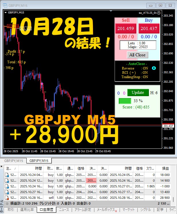 【GBPJPY M15】前日の結果『ATS-25』 10月28日