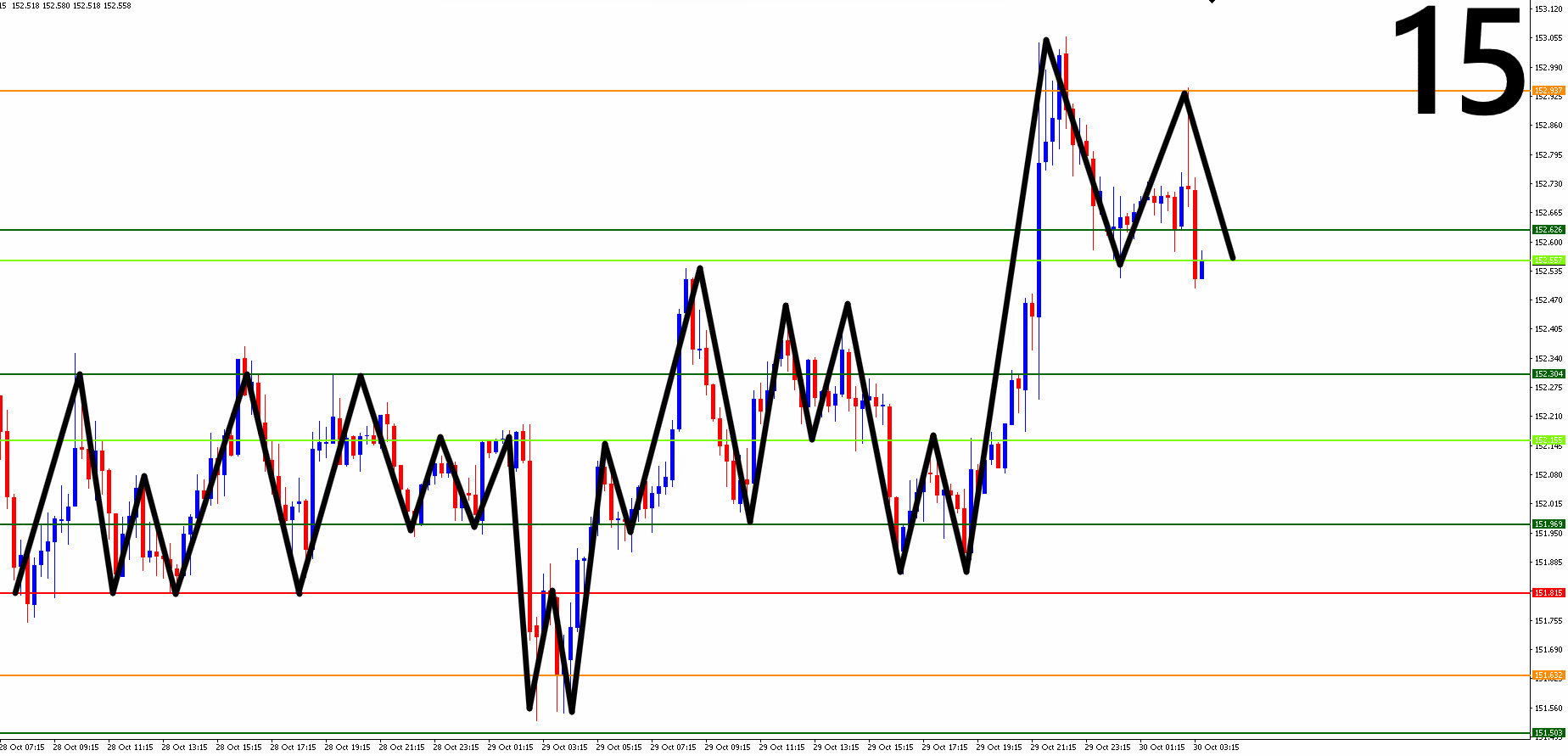 ●日足・4時間足・1時間足・15分足までの相場を水平線と波動(ダウ理論)を使って環境認識し、勝率の高いエントリーポイントを3つに絞る
