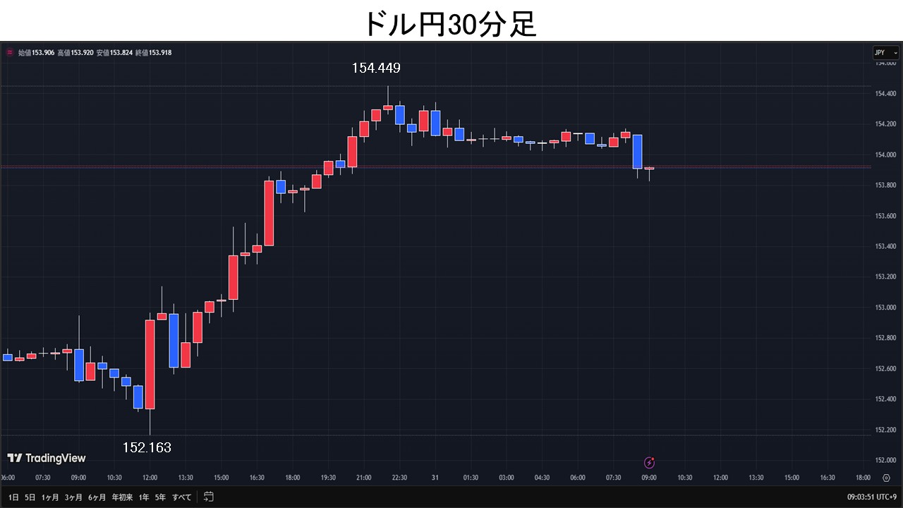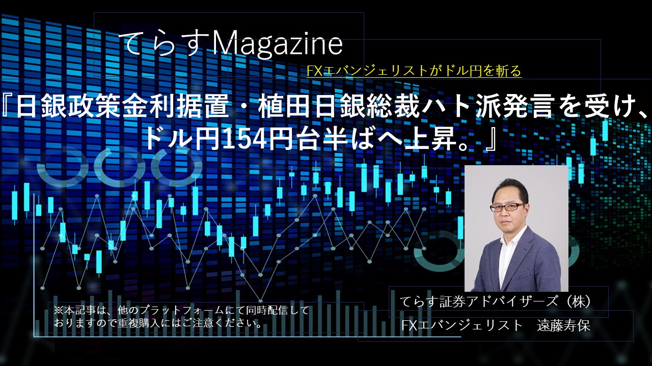 日銀政策金利据置・植田日銀総裁ハト派発言を受け、ドル円154円台半ばへ上昇。