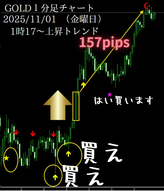 GOLD 1分足|2025年11月1日(金)1時17分スタート