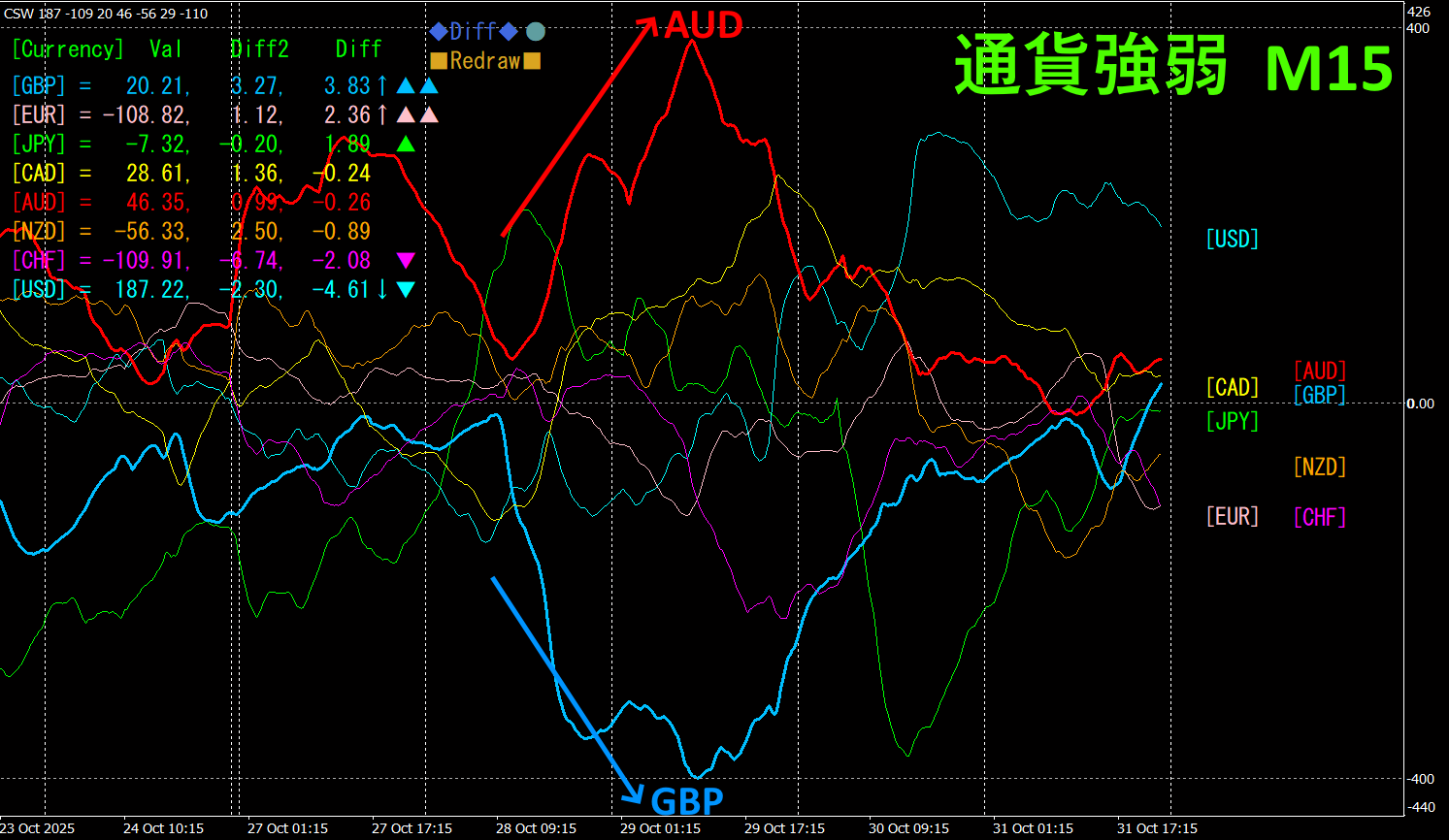 15分足の通貨強弱グラフを見ると、AUDとGBPが、見事な逆相関関係になっていることがわかります。AUDとGBPの関係は、AUD>GBPで、AUDとGBPが拡散して広がっている部分だけに注目し、GBPAUDの売りでトレードすれば良いのです。 今一番大きく伸びていて、逆相関関係にある通貨ペアを選びトレードすれば、自ずと結果が付いてきます。