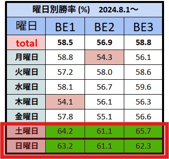 バイナリー仮想通貨1分判定用「BE」は、8時~翌朝5時までの勝敗と曜日別の結果も集計しております。