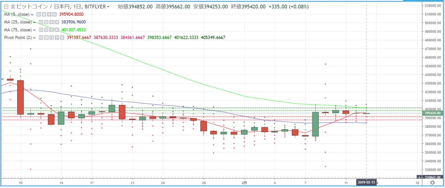 画像は2019年2月13日のキャプチャ。昨日はビットコインを除く主要どころが、上昇していました。その流れが反転し、今日は1~4%の下落となっています(イーサリアムは1%の上昇)。