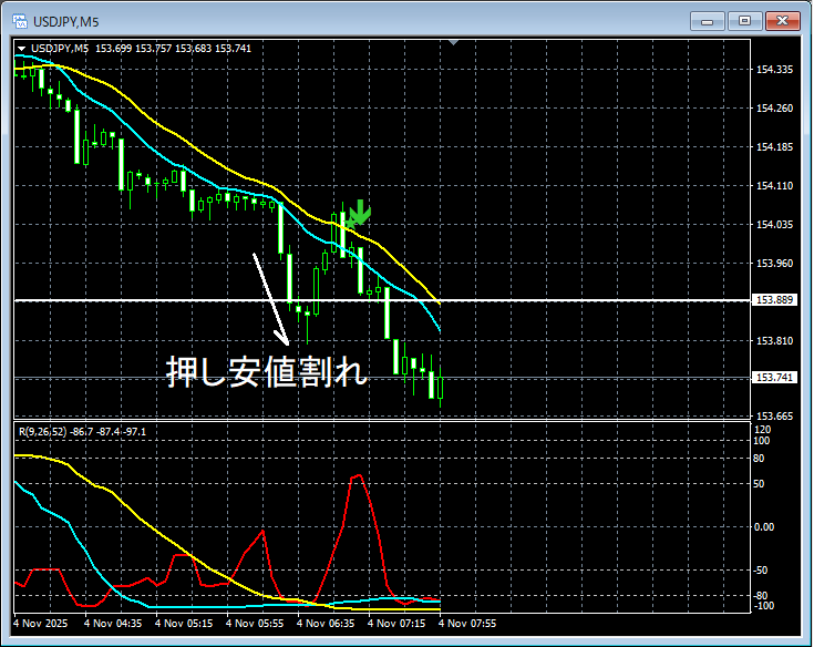 百戦錬磨【RCIを極めて移動平均線フィルターで勝つ!!】ドル円 5分足 押し安値割れとmBDSRの戻り売りサイン