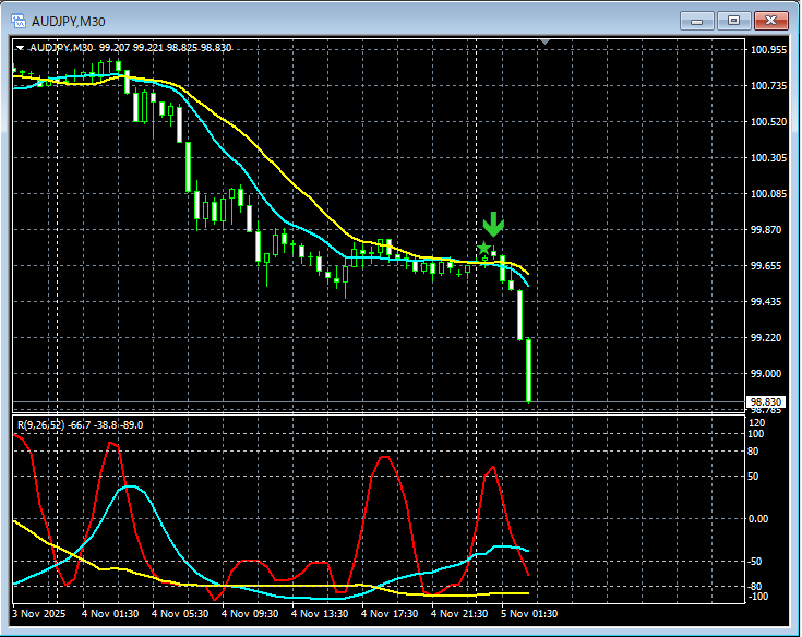 百戦錬磨【RCIを極めて移動平均線フィルターで勝つ!!】豪ドル円 30分足 mBDSRの戻り売りサイン