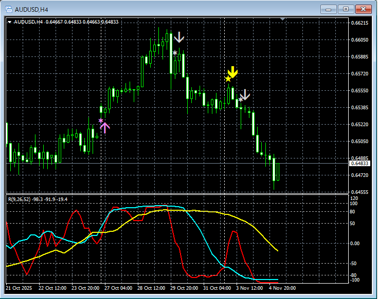 百戦錬磨 mBDSR(RCI2本フィルター)のサインとR1R2S2のサインの両方を活用する(66) AUDUSD 4時間足