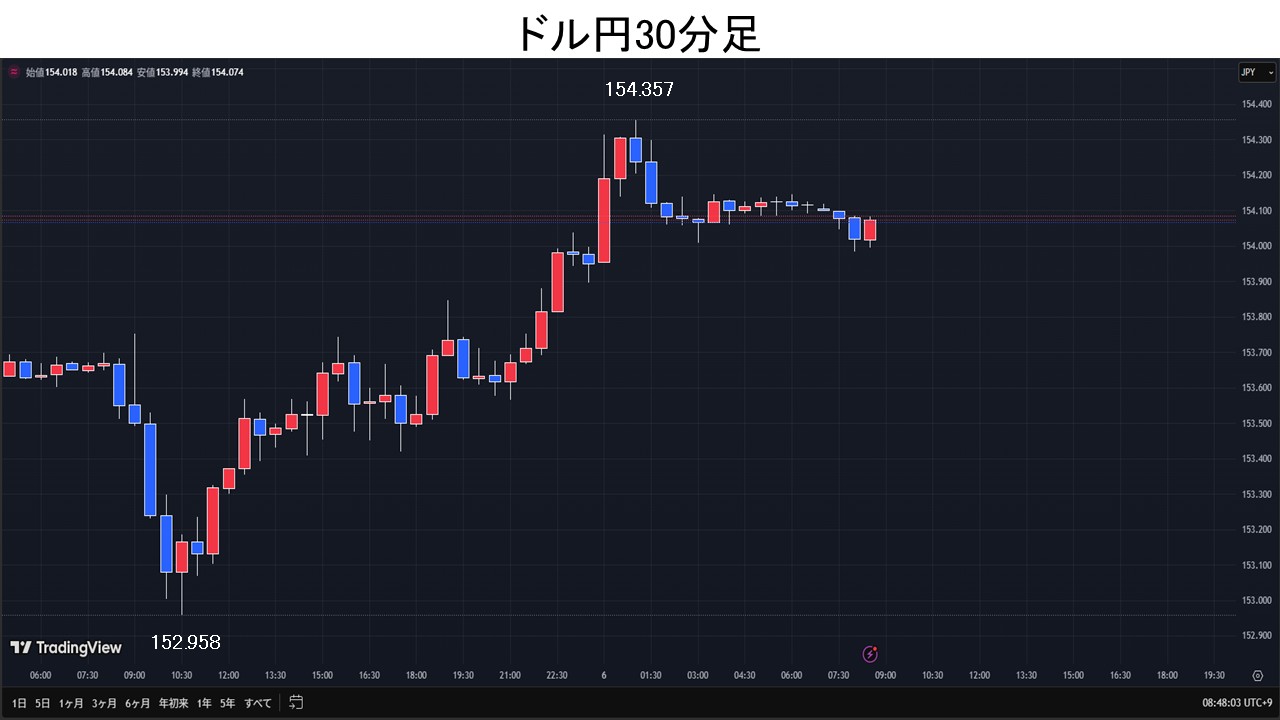 東京時間、日経平均が2400円超暴落すると、リスク回避のドル売り/円買いが先行し、ドル円は152.95円まで下落。その後、日経平均が下げ幅を縮小させると、ドル円は153.60円前後まで買い戻された。欧州時間、ドル円は153.60円を挟む揉み合い。NY時間、米10月ADP雇用統計が予想上振れ、米10年債利回りが上昇すると、米景気減速懸念が和らぎ、リスク回避懸念も落ち着き、ドル円は154.35円まで上昇。