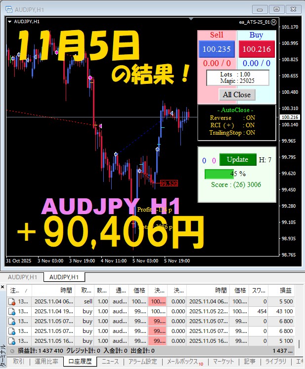 【前日の結果】AUDJPY H1 / M5 『ATS-25』11月5日