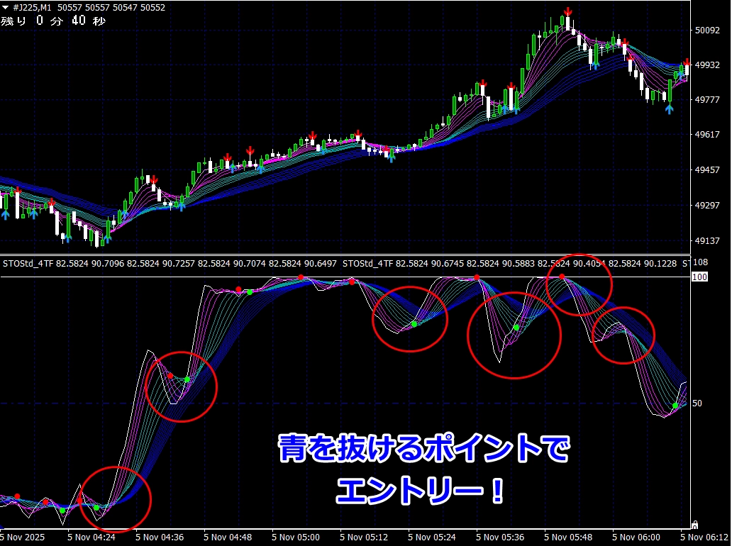※ サイン点灯=エントリーではありませんので、インジケーターが緑帯をすくい上げるような形状でない場合は、エントリーしません(サイン点灯でエントリーできる頻度は、数回に1度くらいです)。