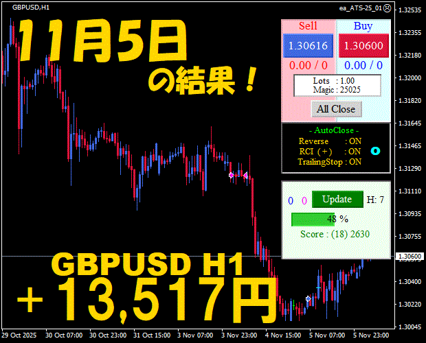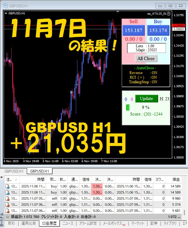 【前日の結果】GBPJPY H1 / M5 『ATS-25』11月7日
