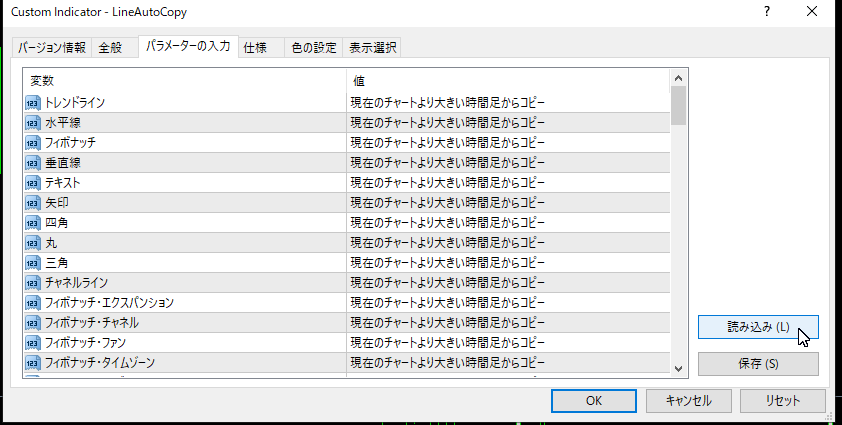 .setファイルは、同じインジケーターでのみ正しく読み込むことができます。- 別のPCや別のMT4で使用する場合は、対象のMT4の