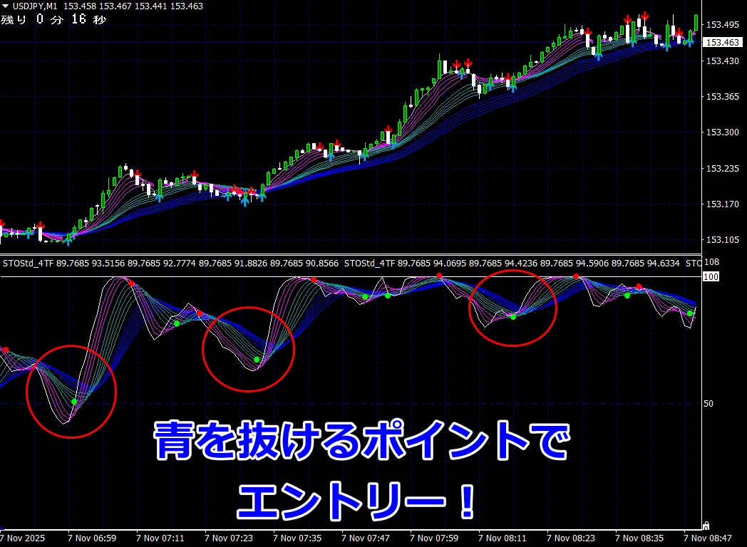 ※ サイン点灯=エントリーではありませんので、インジケーターが緑帯をすくい上げるような形状でない場合は、エントリーしません(サイン点灯でエントリーできる頻度は、数回に1度くらいです)。