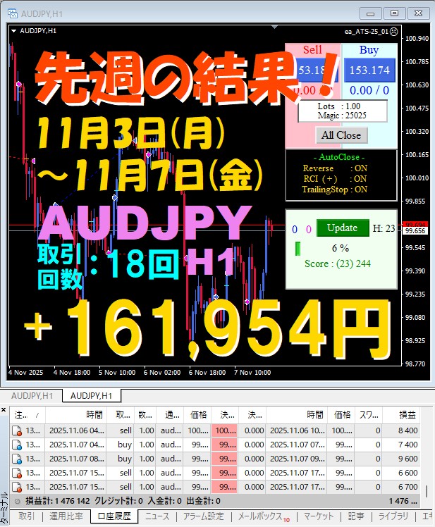 【先週の結果】AUDJPY H1 『ATS-25』11月3日(月)~11月7日(金)