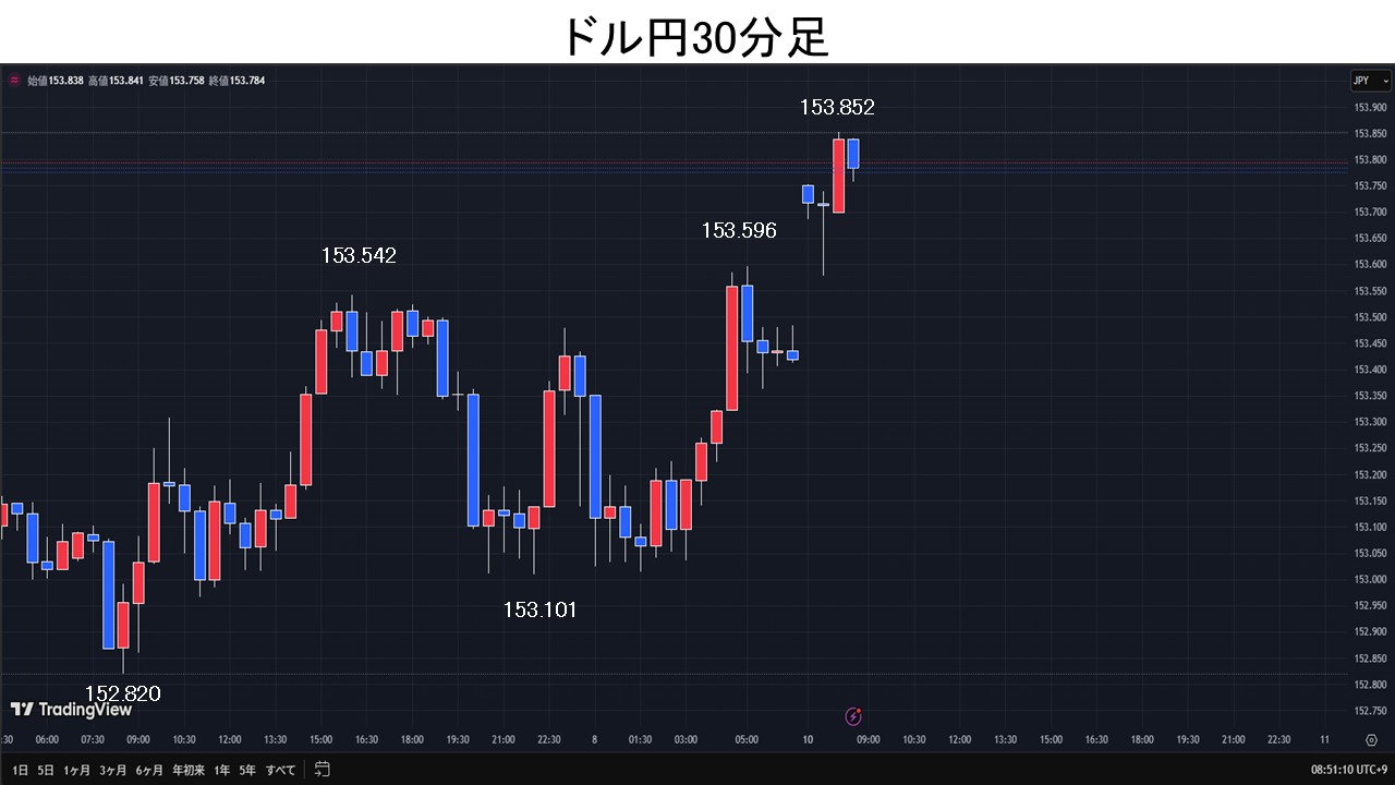 東京時間、ドル円は朝方152.82円まで下押しとなるが、本邦実需勢のドル買いが観測や、時間外の米10年債利回り上昇などで下げ渋り。また、一時は急落していた日経平均が、引けにかけて下落幅を縮小させた事などを受け、153円台半ばまで上昇。欧州時間、ドル円は153円台前半中心に小動き。NY時間、11月米ミシガン大学消費者態度指数・速報値予想下振れ・米10年債利回りが低下するとドル円は153.01円まで下落。その後、米上院民主党は政府機関の再開を巡る交渉で、医療保険制度(オバマケア)への補助金の1年延長を提案。政府機関の閉鎖解消に向けた期待が高まると、ドル円は153.59円まで上昇。