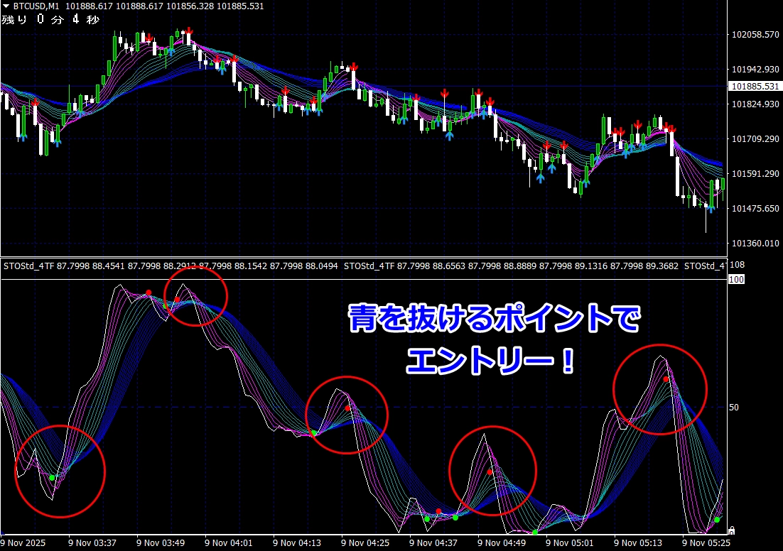 ② 矢印サイン点灯状態で、インジケーターのピンク色の帯が、緑の帯を下からすくい上げるような形状であれば、現在のローソク足が確定する数秒前か確定の直後に1分判定または3分判定でハイエントリーします。