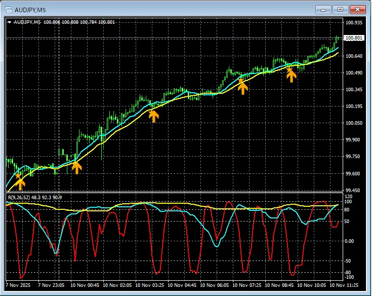 百戦錬磨【RCIを極めて移動平均線フィルターで勝つ!!】豪ドル円 5分足 mBDSRの押し目買いサイン