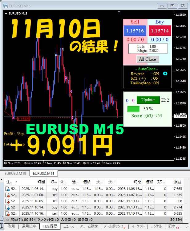 【EURUSD M15】前日の結果『ATS-25』 11月10日
