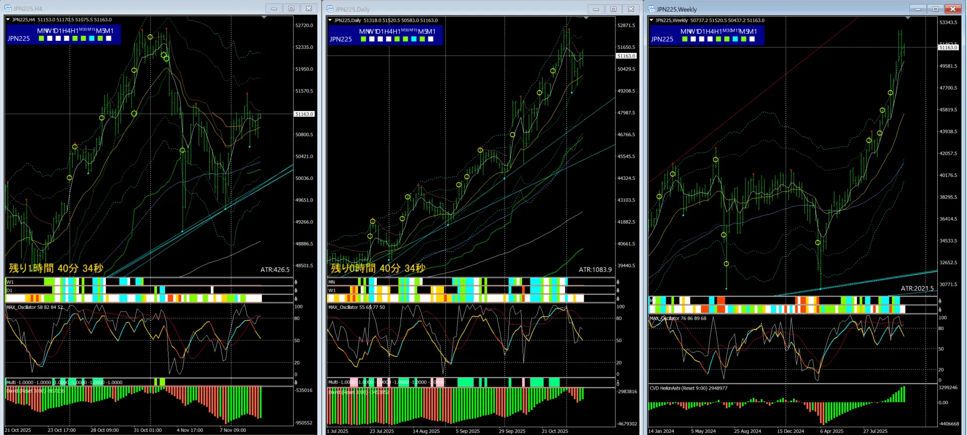 一方で、週足のMAXオシレーター、シンクロバンドは「中立」を示唆
