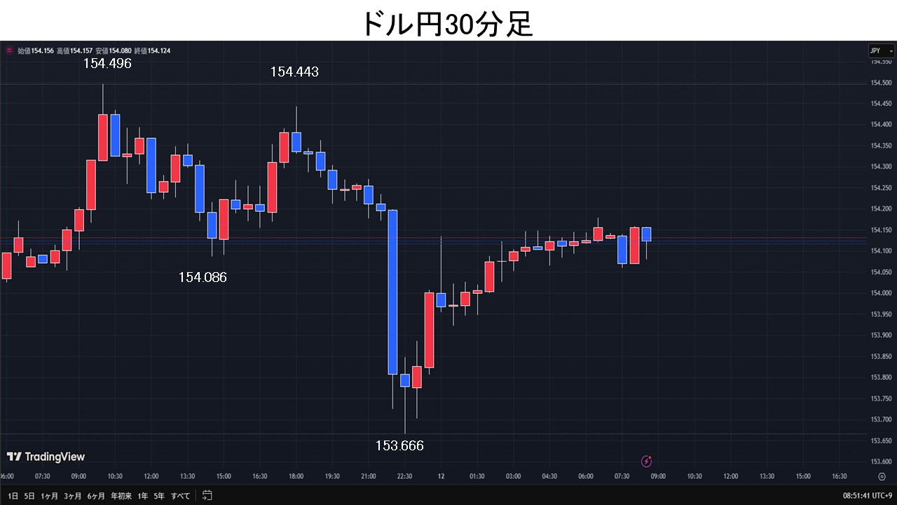 東京時間、ドル円は日経平均の上昇を受けリスク・オンの流れ継続となり、一時154.49円と11/4の高値154.48円を上抜けた。その後、米上院で政府機関の再開に向けた法案が可決された。閉鎖解除後のポジション調整の売りなど警戒して、後場の日経平均がマイナス圏まで失速すると、ドル円も154.08円まで下押し。欧州時間、ドル円は欧州株の上昇を受け154.44円まで上昇。NY時間、ADPが発表した米民間雇用者数が10/25終了週までの4週間に週平均で1万1250人減少したと伝わると全般ドル売りが先行し、ドル円は153.66円まで下落。しかし、追随する売りはなく、引けにかけては154.18円まで買い戻された。