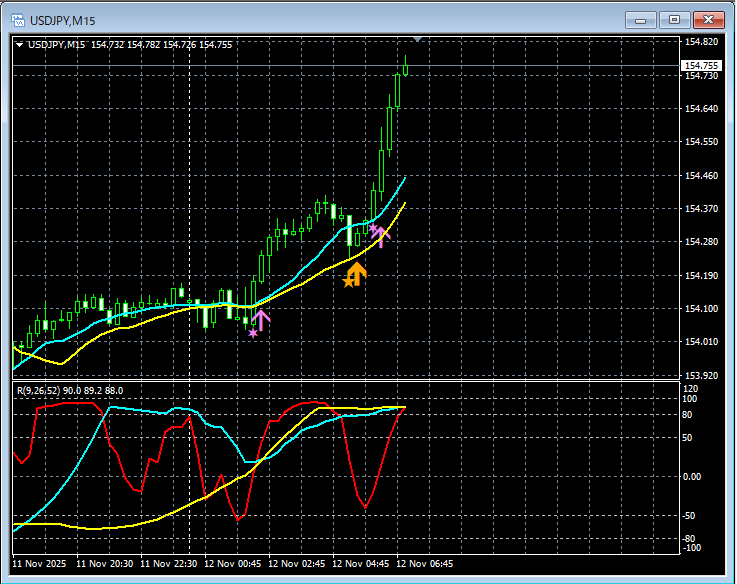 上のチャートでは、mBDSR(MA2本フィルター)とR1R2S2のサインがタイミングよく点灯している。