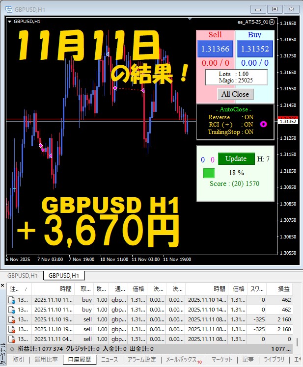 【前日の結果】GBPJPY H1 / M5 『ATS-25』11月11日