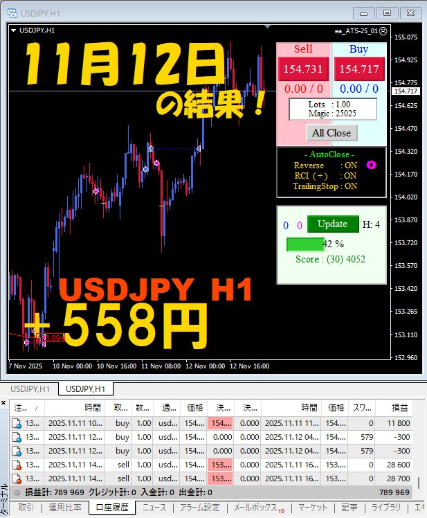 【前日の結果】USDJPY H1 / M5 『ATS-25』11月12日