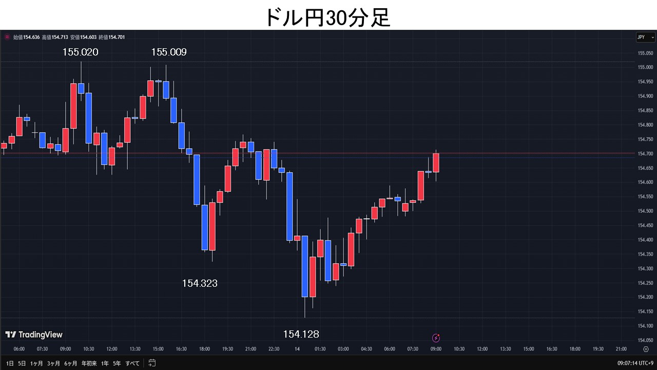米経済後退懸念でドル円は154円台前半へ下押し。