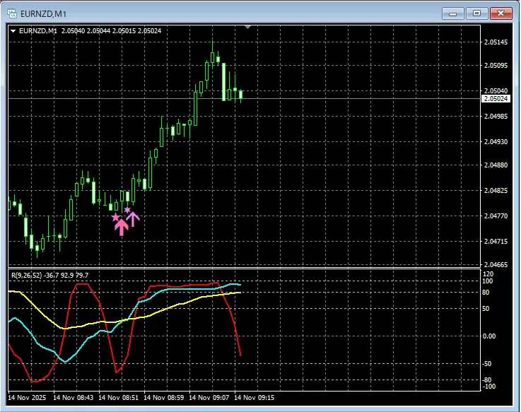 百戦錬磨 mBDSR(RCI2本フィルター)のサインとR1R2S2のサインの両方を活用する(69) EURNZD 1分足