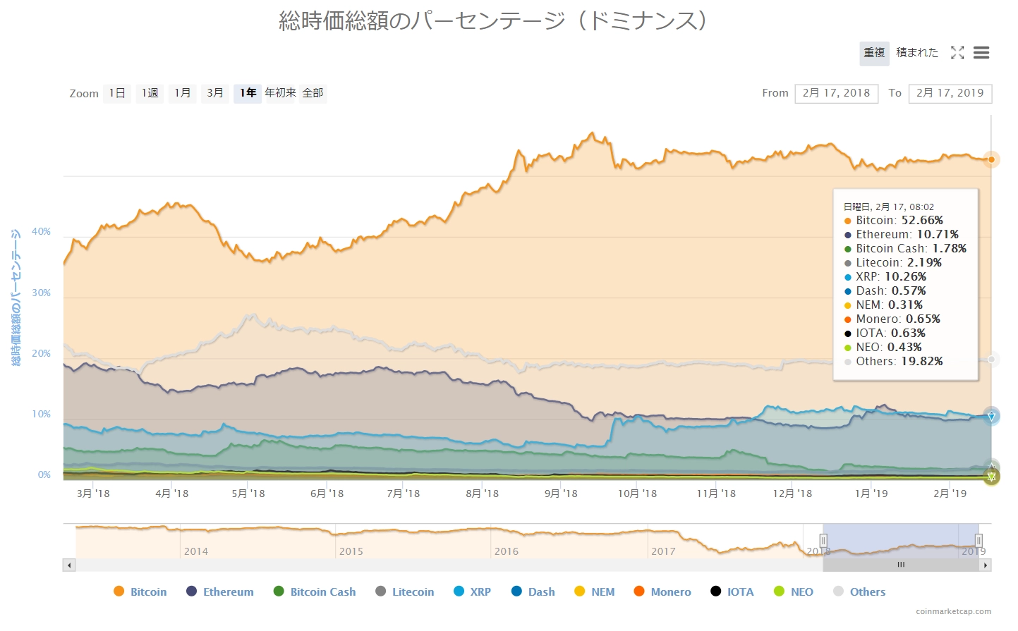 画像は2019年2月15日のキャプチャ。昨日は主要どころが1~3%の上昇となっていました。今日はビットコイン、ビットコインキャッシュが小幅下落の「赤」で、リップル、イーサリアム、ライトコインは小幅上昇の「緑」となっています。