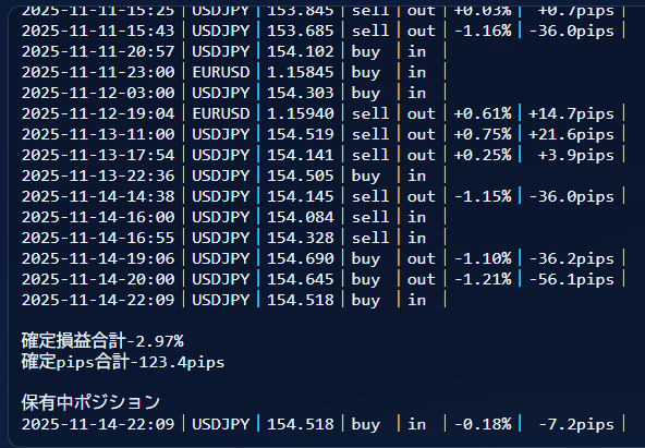2025-11-14-22:09|USDJPY|154.518|buy |in |-0.18%| -7.2pips|
