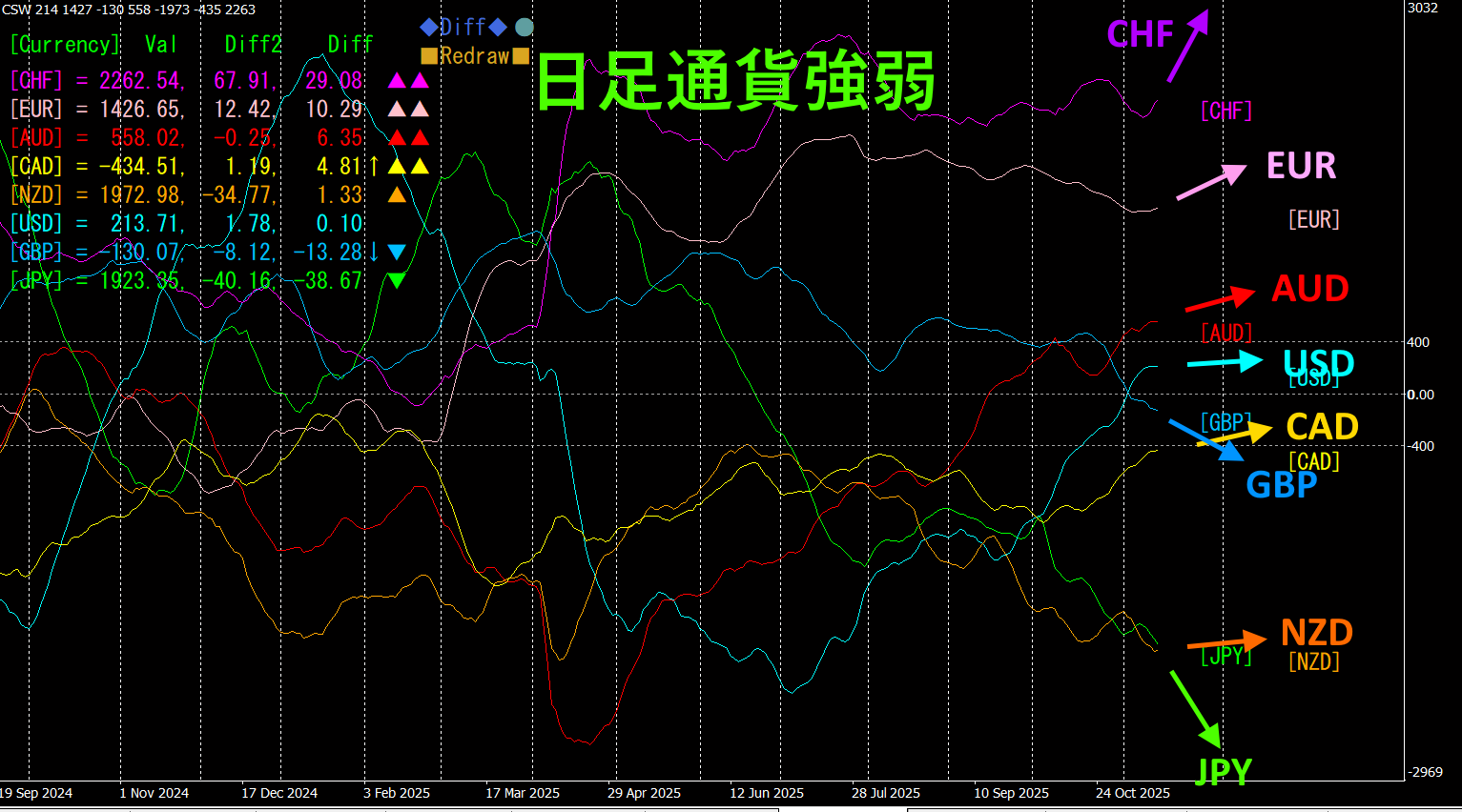 CHF、EUR、AUD、CADが上向きです。NZD、USDが水平、JPY、GBPが下向きになっています。日足では、CHFの上昇とJPYの下落が目立っています。