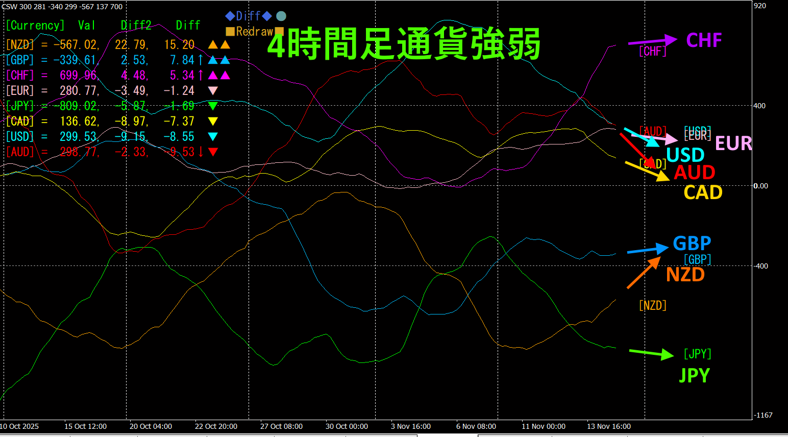 4時間足では、NZD、GBP、CHFが上向きに、AUD、USD、CAD、JPY、EURが下向きになっています。