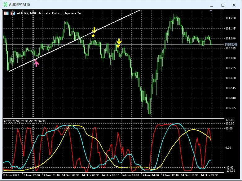 【RCIを極めて勝つ!!】カウンタートレンドラインとmBDSRのサイン 豪ドル円 10分足