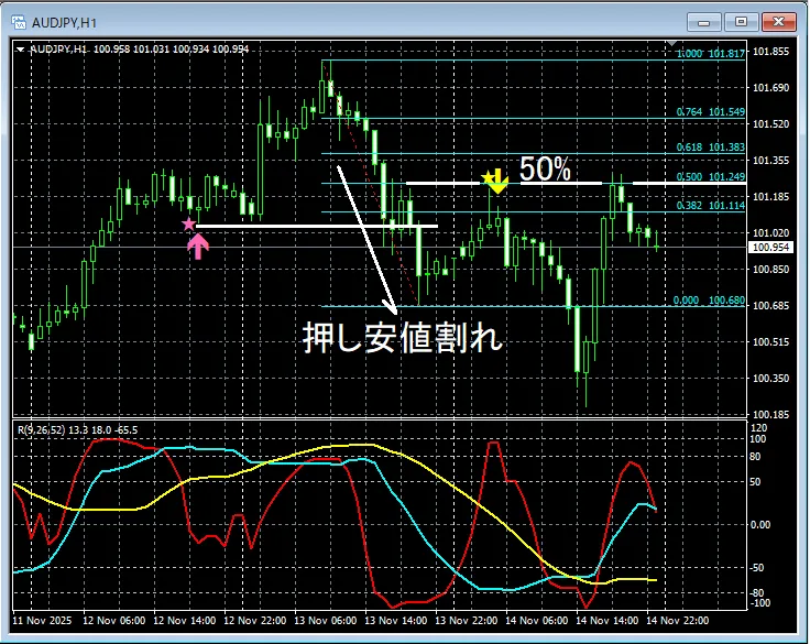 【RCIを極めて勝つ!!】押し安値割れとフィボナッチとピンバーとmBDSRのサイン 豪ドル円 1時間足
