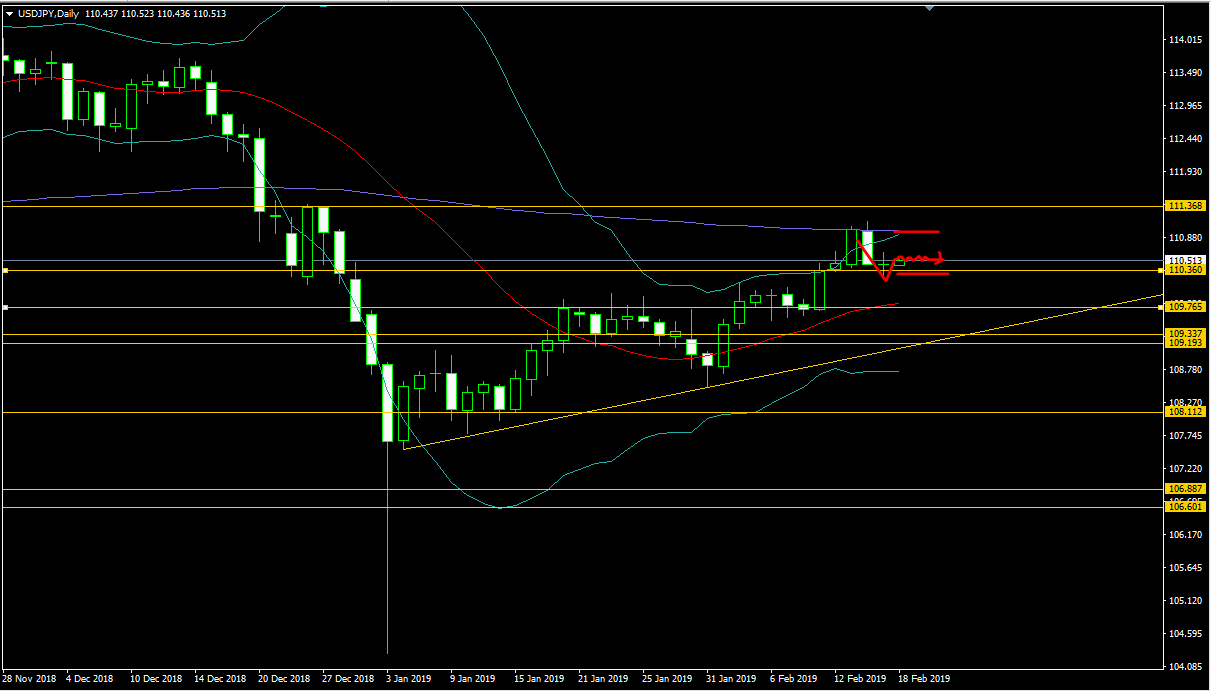 ドル円の日足チャートから見てみます。ドル円日足では、きれいなダウ理論を描きながら上昇トレンドを形成していますが、先日機関投資家も注目する唯一強力な壁として機能するとされる紫200MAに頭を抑えら急激に下落させられました。しかしながら下落後、今度は強めと思われる110.360円のサポートラインに到達後は上方向へ弾き返されほぼ確実にこの2本のサポレジが機能していると思われます。今後しばらくはこの紫200MAとドル円110.360円のサポレジ間を推移するものと予想されます。