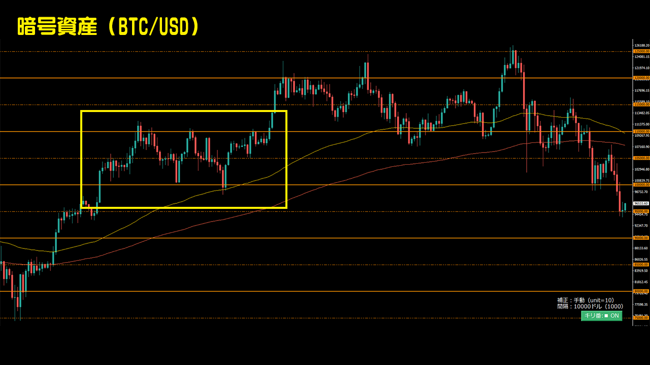 特にBTCは値幅が大きく、1万ドル単位の節目が強く意識される特殊な市場です。