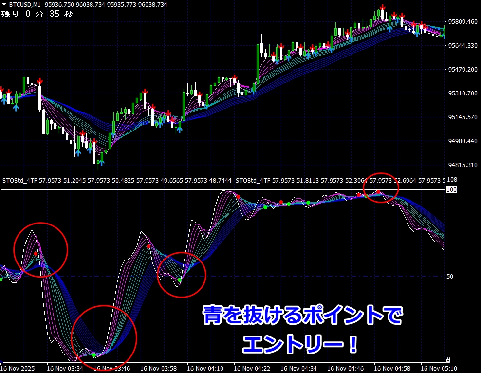 ※ サイン点灯=エントリーではありませんので、インジケーターが緑帯をすくい上げるような形状でない場合は、エントリーしません(サイン点灯でエントリーできる頻度は、数回に1度くらいです)。