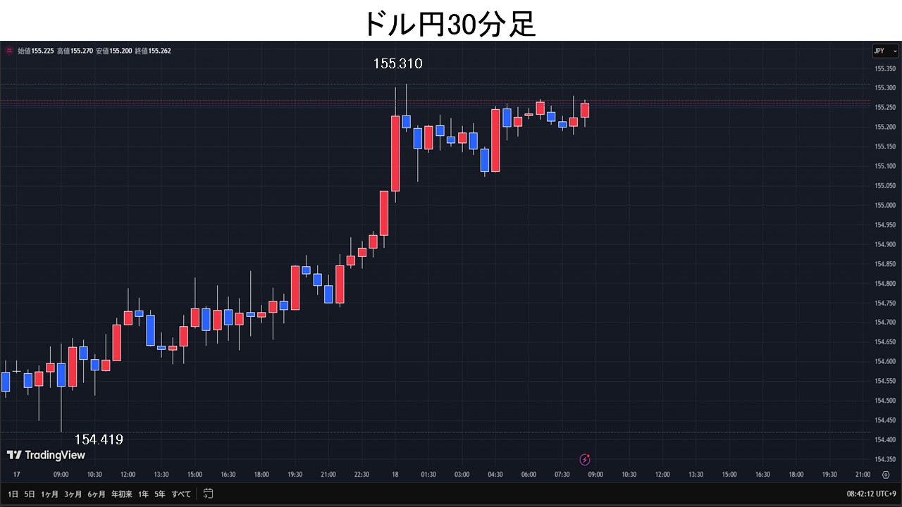 東京時間、ドル円は、154.60円を挟む小動き。欧州時間、高市政権の拡張的財政政策が意識されて全般円売りが先行。NY時間、米利下げ観測後退・11月米ニューヨーク連銀製造業景気指数の予想上振れなどでドルが買われると、ドル円は11/12の高値155.04円を上抜けると一時155.31円と2/4以来の高値を更新。