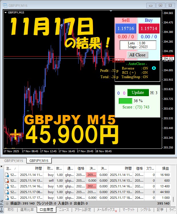 【GBPJPY M15】前日の結果『ATS-25』 11月17日
