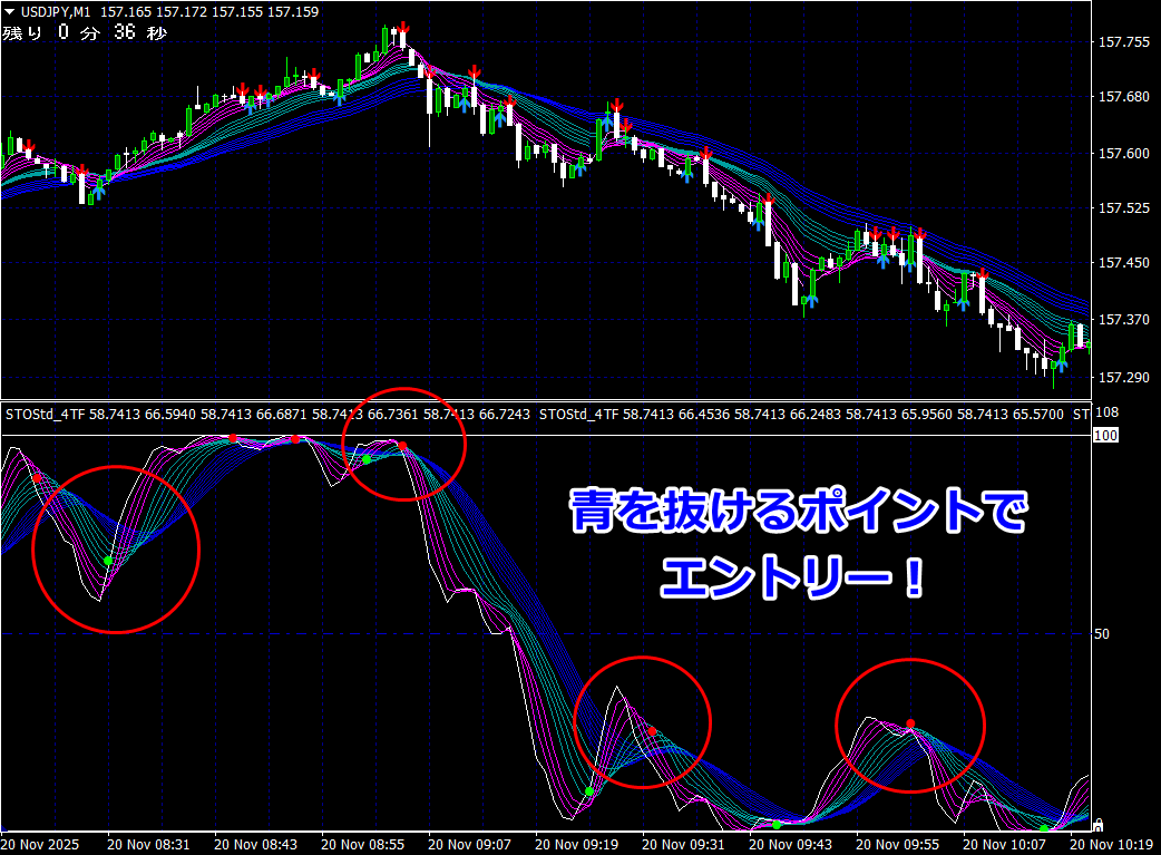 インジケーターの帯はピンク・緑・青の3層構造で、3層の帯は、収斂と拡散を繰り返しますので、 上昇時は、上から ピンク・緑・青 の並びとなり、下落時は、その逆で、上から青・緑・ピンクの並びになります。
