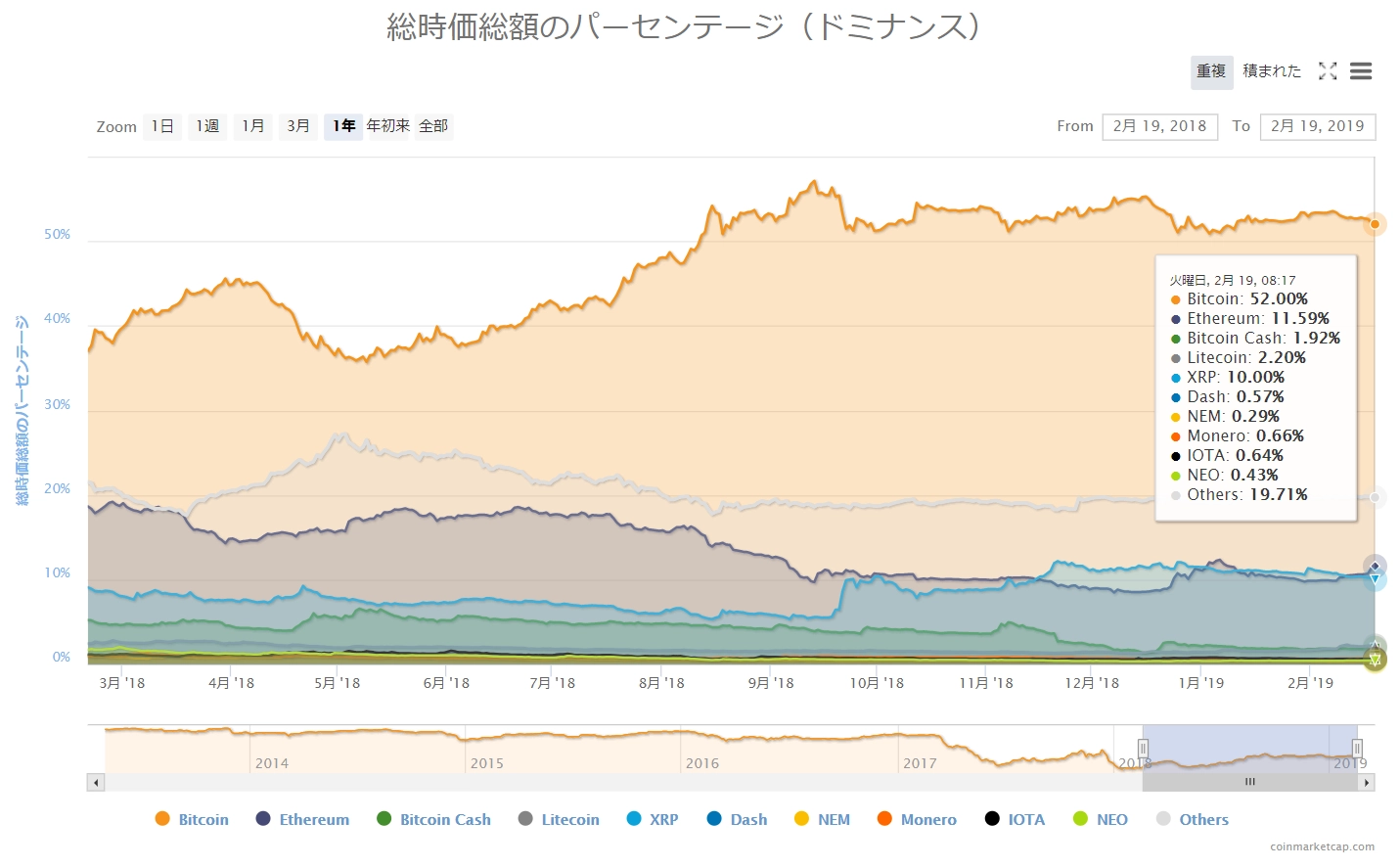 画像は2019年2月19日のキャプチャ。昨日は主要どころが1~7%の上昇となっていました。そして、今日は全面的に「濃緑」が目立つ相場環境に! 主要どころで特に上昇著しいのが、ビットコインキャッシュの15%、次いでイーサリアムの9%、ライトコインの8%、リップルとビットコインの約7%となっています。
