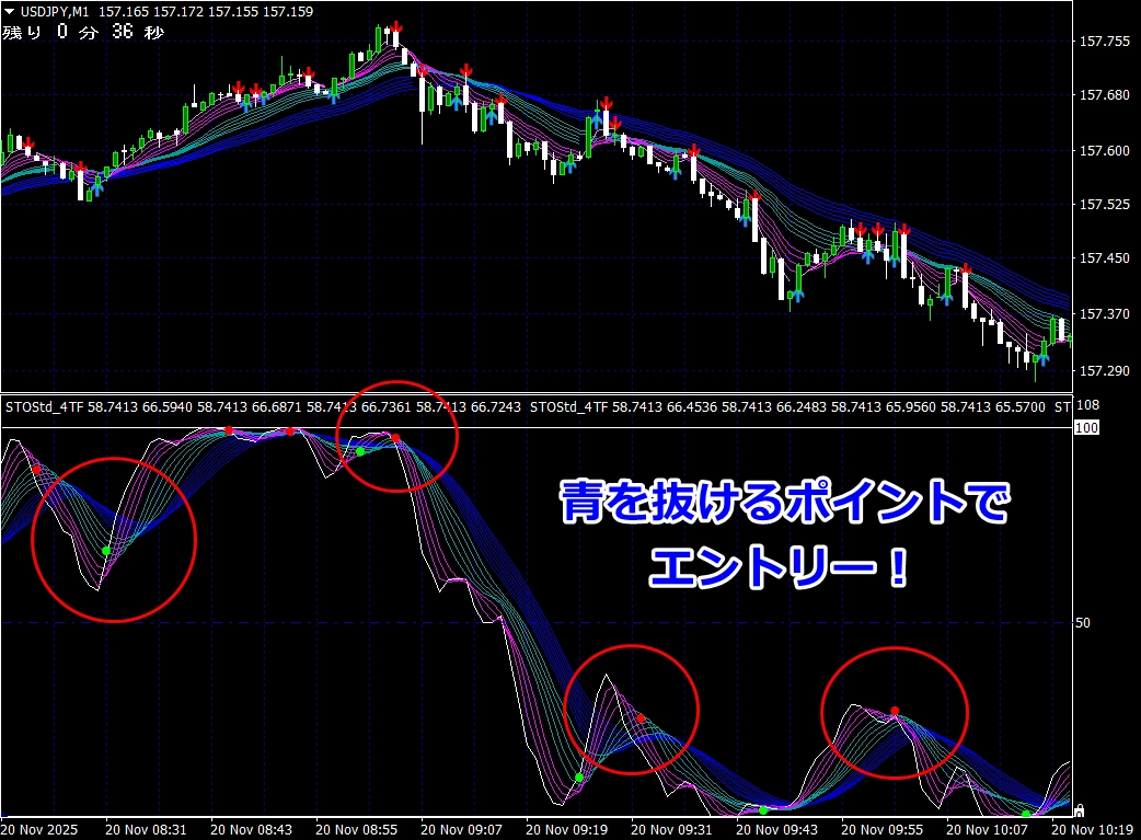 ※ サイン点灯=エントリーではありませんので、インジケーターが緑帯をすくい上げるような形状でない場合は、エントリーしません(サイン点灯でエントリーできる頻度は、数回に1度くらいです)。