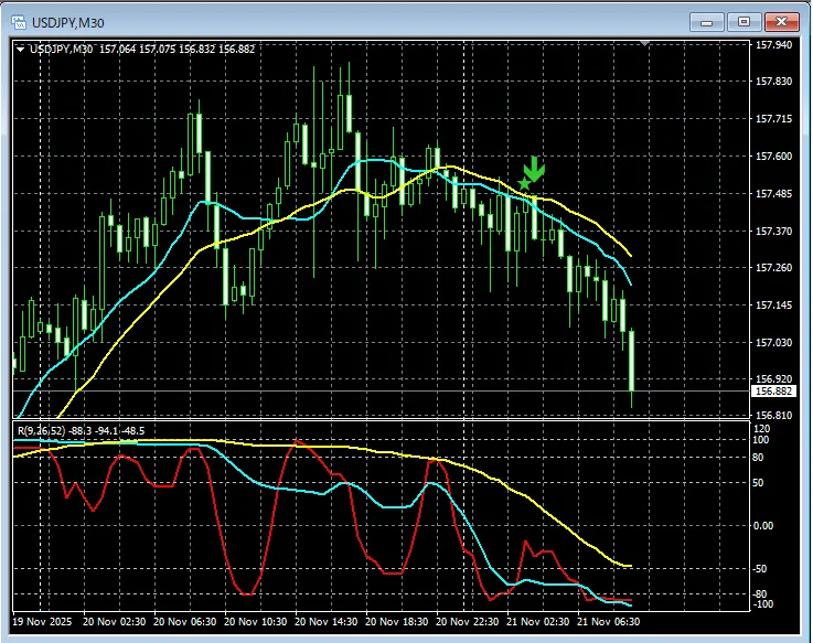 百戦錬磨【RCIを極めて移動平均線フィルターで勝つ!!】昨日のドル円 30分足 mBDSRの戻り売りサイン
