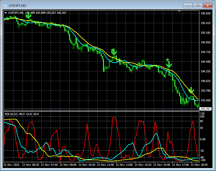 百戦錬磨【RCIを極めて移動平均線フィルターで勝つ!!】昨日のスイスフラン円 5分足 mBDSRの戻り売りサイン