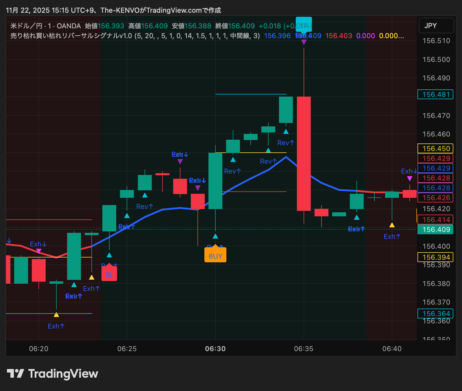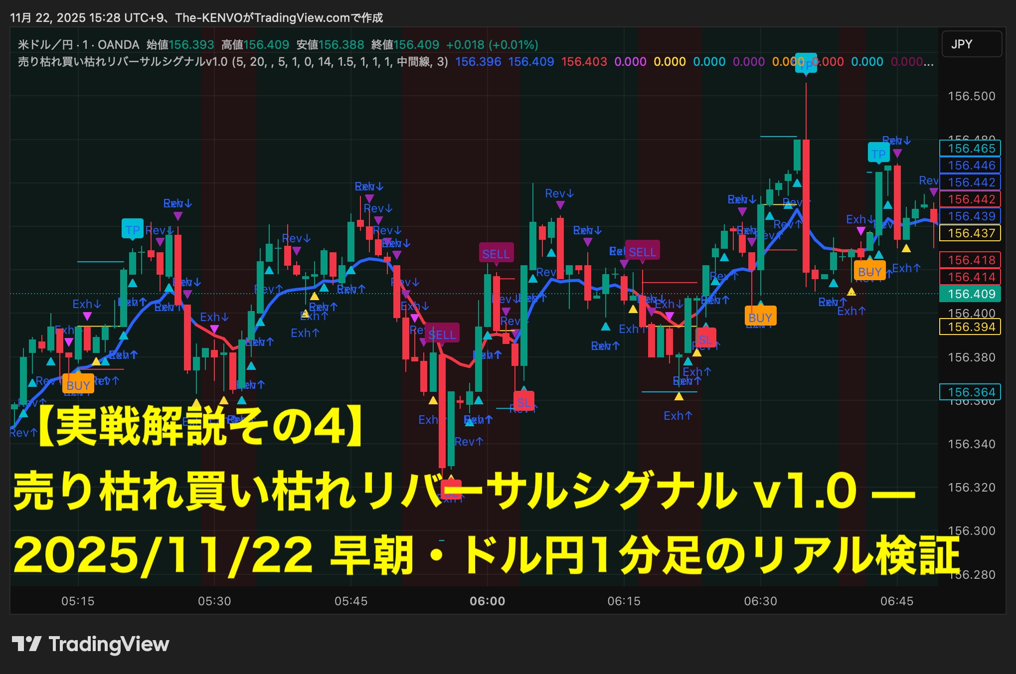 【実戦解説その4】売り枯れ買い枯れリバーサルシグナル v1.0 —2025/11/22 早朝・ドル円1分足のリアル検証