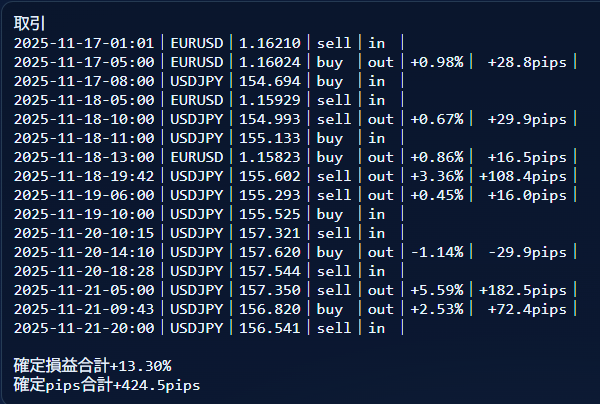 2025-11-21-09:43|USDJPY|156.820|buy |out|+2.53%| +72.4pips|