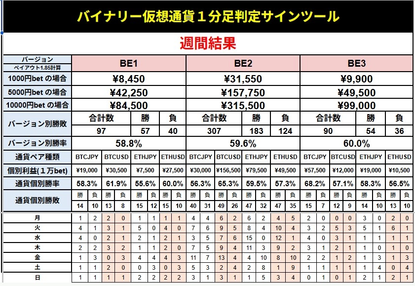 800万円超え!【週報:2025.11.17-2025.11.23】バイナリー仮想通貨1分足判定用 オリジナルツール「BE」結果